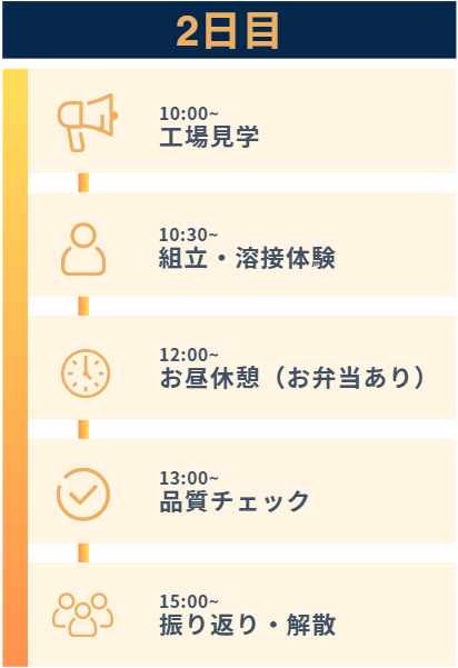 2日間かけて、ものづくりの流れに沿って、4種類の仕事体験ができるプログラムです。