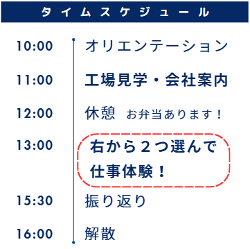午前中はものづくりの流れを学び、午後は2つの仕事体験ができる1dayプログラムです。